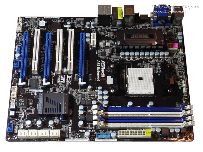 Другие примеры показывают, насколько чипсет AMD A75 универсален. Очередная плата, ASRock A75 Extreme6, отличается рекордными возможностями расширения, включая три PEG-слота.