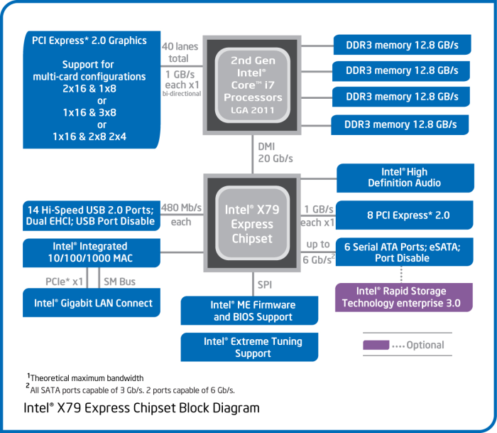 Важным событием в секторе high-end систем является выход долгожданной платформы Intel LGA2011. В рамках одной системы объединены сильные стороны двух предыдущих: возможности построения мощной графической станции от LGA1366 и высокопроизводительное процессорное ядро Sandy Bridge, которое до сих пор было доступно только в исполнении LGA1155. Фактически перед нами самая мощная система как по скорости работы, так и по возможностям расширения. Впрочем, по последнему критерию чипсеты Intel не являются лидерами. Так, чипсет X79 поддерживает всего два канала SerialATA 6 Gb/s и вовсе не поддерживает шину USB 3.0 (как и шину PCI). Разработчики материнских плат, как мы уже говорили, компенсируют недостатки чипсета путем установки многочисленных дополнительных контроллеров. Это увеличивает цену платы, но для high-end продуктов с ценой более 10 000 рублей данная прибавка стоимости незначительна.