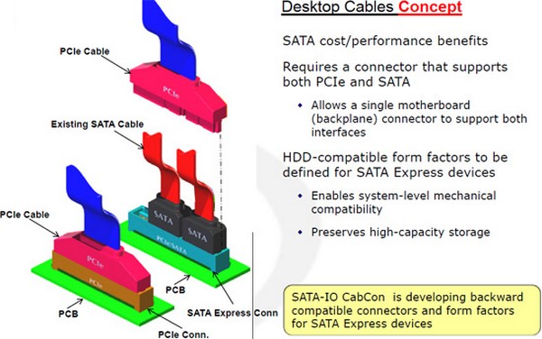 Группа SATA-IO работает над физическим стандартом для SSD с «родным» интерфейсом PCI-E. Уже представлены эскизы комбинированных разъемов, которые могут выдать одному устройству две линии PCI-E 3.0 либо два отдельных канала SATA. Для самих приводов будут разработаны форм-факторы, совместимые с отсеками для HDD. Между тем контроллеры, непосредственно работающие с шиной PCI-E, пока только начинают использоваться в enterprise-устройствах и в потребительских SSD появятся не скоро.