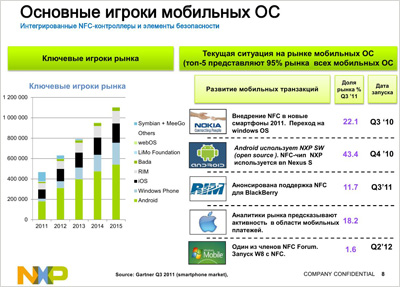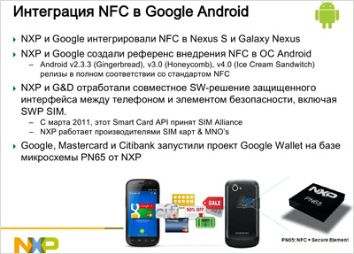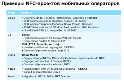 В России уже сейчас четыре банка, а именно: «Райффайзен», Московский индустриальный банк, «Петрокоммерц» и Альфа-Банк — выдают карты с поддержкой NFC. Правда, использовать их пока почти что негде. Разве что оплатить билет на московский аэроэкспресс да купить товары в некоторых магазинах. Тем не менее Виктор Сестреватовский из компании NXP считает, что «2012 год окажется решающим с точки зрения развития NFC-технологий» и «NFC начнет активно развиваться в России». По его словам, как минимум 15 крупных OEM-производителей уже сейчас разрабатывают более 130 моделей телефонов и планшетов с поддержкой этого стандарта. За 2011 год было отгружено порядка 40 млн смартфонов с NFC-чипами на борту, а это примерно 10% от общего объема поставок, то есть не так уж много.