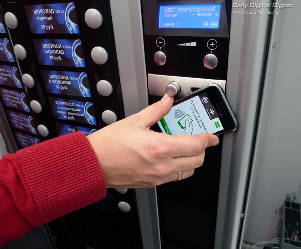 Аппарат по продаже кофе. Можно не только расплатиться с помощью смартфона, но и тут же пополнить счёт своего NFC-кошелька