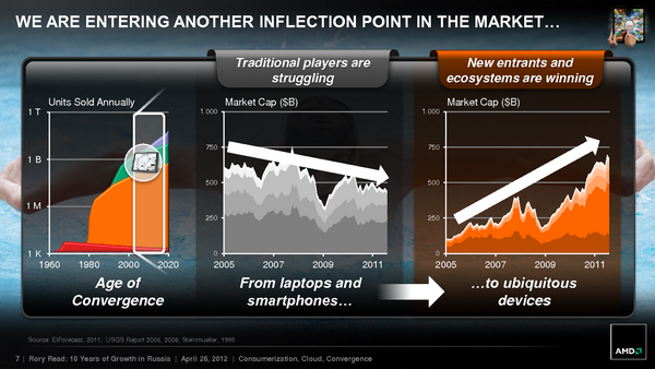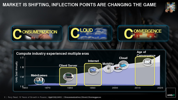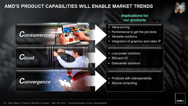 Но AMD, естественно, хочет расти быстрее, выше, сильнее, именно поэтому компания и желает сменить направление развития. В основе новой стратегии лежат три латинские буквы C: Consumerization, Cloud, Convergence. То есть теперь AMD хочет стать еще ближе к пользователям, не отставать от модных облачных трендов и делать все для упрощения взаимопроникновения информации с устройства на устройство.