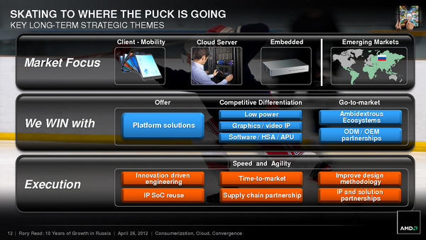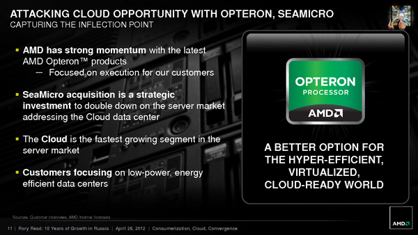 Что значит для AMD каждый из трех C-китов, как они выражены в ее деятельности и продукции? Consumerization — направленность на пользователя — подразумевает конкурентную цену, достаточную производительность, универсальность продукта и высокую степень интеграции. Хороший тому пример — мобильные APU Llano и Brazos, которые в своих ценовых сегментах неплохо потеснили чипы Intel именно за счет «вкусной» цены и сбалансированности решений. Cloud — облачные технологии — AMD рассматривает с точки зрения того, что она может предложить провайдерам облачных сервисов. А предложить она может низкое энергопотребление серверов, эффективность и уникальные решения на базе технологий недавно приобретенной SeaMicro, которые позволяют значительно увеличить производительность на ватт. Ходят слухи, что и у теряющих рынок «Оптеронов» есть второй шанс, потому как ими заинтересовалась Apple. Рид такие (и другие — тоже) слухи не комментирует. Последний кит, Convergence — взаимопроникновение — для компании значит создание широкого класса совместимых продуктов, а также высокую степень безопасности.