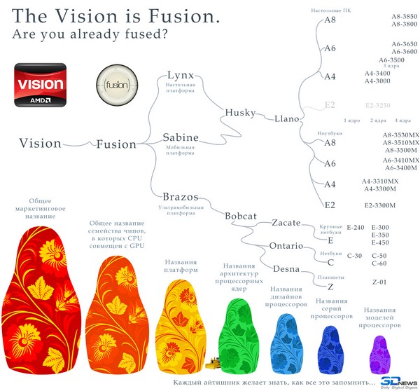 AMD сейчас задает вектор развития APU. В 2011 году была выпущена полная линейка гибридных процессоров для компьютеров всех классов: от десктопов до планшетов. Приведем в качестве иллюстрации наши уже знаменитые матрешки. Михалу они тоже очень понравились.