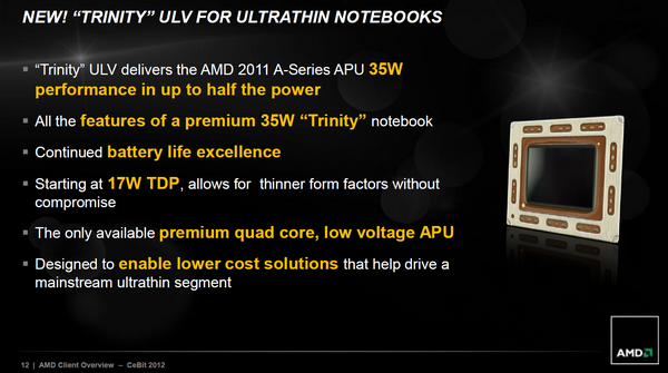 Trinity отличается от Llano в первую очередь новым ядром х86 под названием Piledriver. В чипе их будет два или четыре. А еще — графическим блоком семейства Radeon HD 7000. Будут выпущены как десктопные, так и мобильные варианты Trinity, но с точки зрения архитектуры между ними нет разницы, только в энергопотреблении. TDP для основной массы мобильных чипов составит 35 Вт, но для ультратонких ноутбуков мы приготовили специальную версию с TDP 17 Вт.