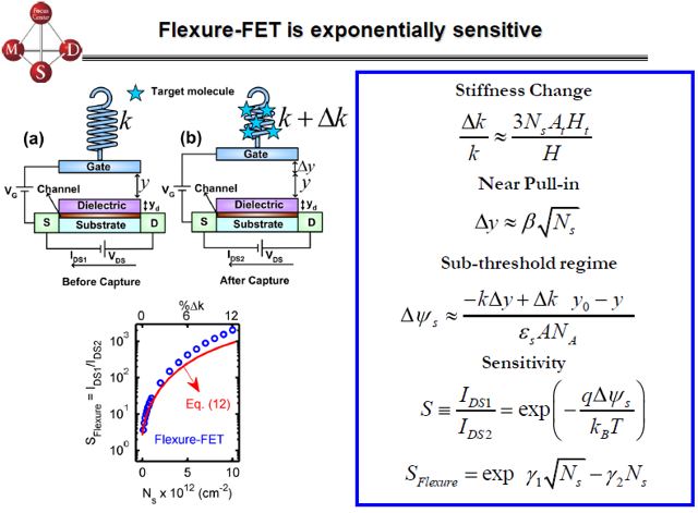 В отличие от обычных механических биосенсоров, где частота вибрации кронштейна или его отклонение, различные для разных типов молекул, замеряются по отклонению лазерного луча, в комбинированной нелинейной электромеханической системе Flexure-FET измерениями вибраций или отклонений занимается тот самый полевой транзистор. Экспоненциальная чувствительность системы достигается за счёт создания дополнительного электрического поля напряжением смещения. Такая "предварительная деформация" связки механического и электрического сенсоров значительным образом отражается на увеличении чувствительности установки в целом.