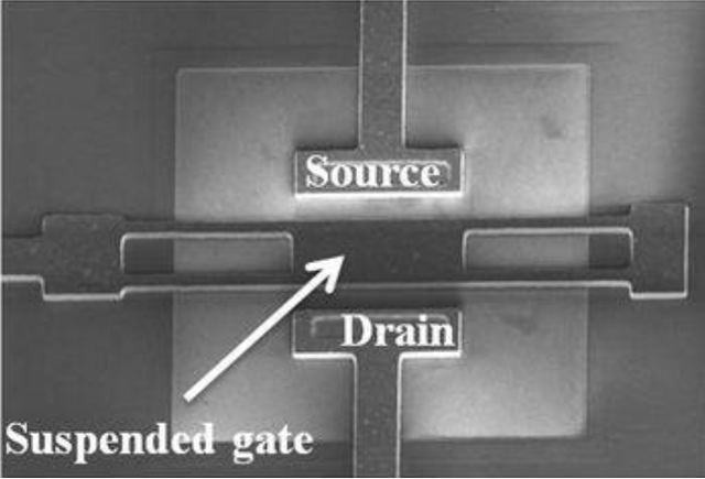Схематически механическая часть нового сенсора Flexure-FET представляет собой закреплённый с одной стороны гибкий кронштейн из посеребрённого кремния – этакий трамплин для прыжков в воду, габариты которого измеряются нанометрами. Под "трамплином" размещается специальный полевой транзистор, играющий роль электрического датчика системы.