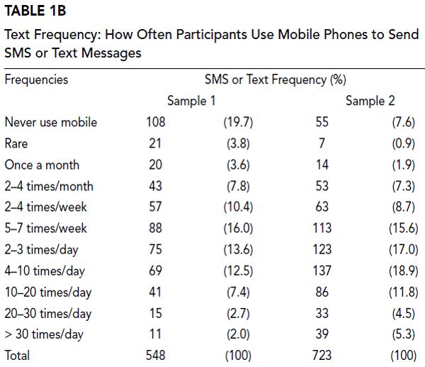 Второй вывод не менее интересен. Никого, в принципе, не удивляет то, что активные, словоохотливые экстраверты, более коммуникативные в социальном плане, чем интроверты, в любом случае являются более активными пользователями мобильников. Удивительно в выводах не это, а обнаруженная корреляция между развитием интеллекта и частотой пользования мобильным телефоном: более высокое интеллектуальное развитие ведёт к уменьшению потребности в использовании мобильного телефона. На психологическом уровне это может также объясняться тем, что более развитые в интеллектуальном плане подростки гораздо меньше интересуются всякой подростковой чепухой вроде сплетен, нежели их сверстники. Кроме того, развитые интеллектуально подростки могут более эффективно выражать свои мысли, используя для этого гораздо меньшее количество звонков и текстовых сообщений.