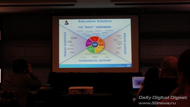 Внимательно слушая доклад господина Раттнера, я не раз ловил себя на мысли о том, как быстро увеличивается разрыв в уровне образовательных систем в разных странах. Совсем недавно – в мае 2012 года — ведущие университеты США провели широкую дискуссию по внесению серьёзных изменений в образовательный процесс, а Гарвард (Harvard University) и МТИ (MIT) даже анонсировали совместную программу современного удалённого онлайнового обучения edX. И тут же руководство Intel спустя всего несколько недель рассказывает о нюансах внедрения новых методик в жизнь на конкретных примерах.