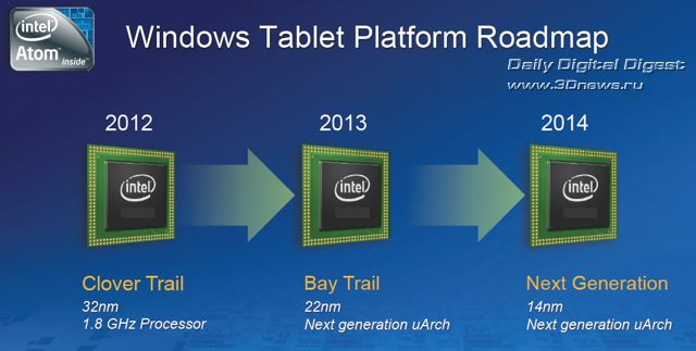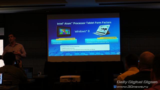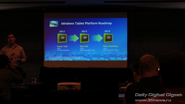 Однако наиболее интересным для наших читателей всё же стоит назвать доклад Гэри Ричмана (Gary Richman) под названием PC Client Solutions Division Update, а также презентацию Криса Уолкера (Chris Walker) под названием Tablet Update. И если в первом докладе больше затрагивались вопросы новых моделей использования, новые форм-факторы портативных и мобильных устройств будущего, то вторая презентация была посвящена вполне конкретному вопросу – будущему сегмента мобильных устройств на платформе Atom.