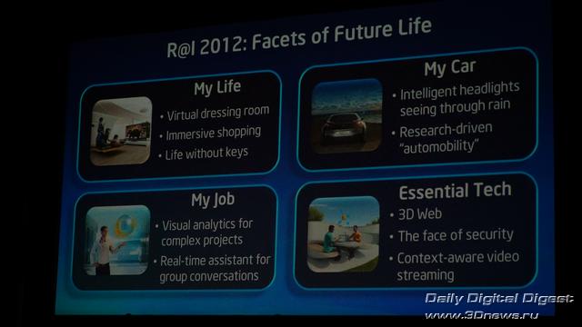 Горячее лето 2012 года ознаменовалось юбилейной встречей журналистов и аналитиков с сотрудниками Intel Labs. Десятое по счёту мероприятие под названием Research@Intel 2012, состоявшееся в Сан-Франциско, включало выступление главы Intel Джастина Раттнера (Justin Rattner) с анонсом программы Facets of Future Life («Аспекты жизни в Будущем»). Кроме того, в рамках встречи был зачитан ряд интересных докладов по насущным вопросам развития технологий от ведущих специалистов различных исследовательских подразделений Intel, а также была представлена выставка с "живой" демонстрацией двадцати новейших научно-исследовательских проектов, вполне заслуживающих звания Технологий Будущего.