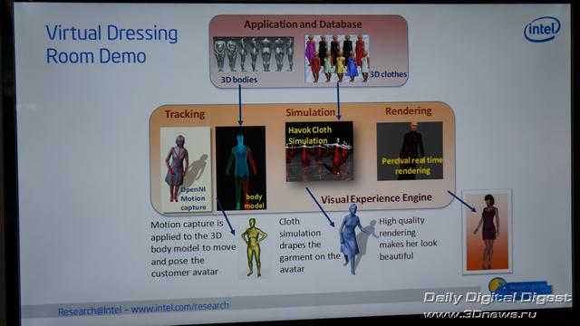 Virtual Dressing Room: специальный софт по результатам съёмки 3D-камер снимет мерки с вашей фигуры и, на основании имеющихся данных о фактуре ткани и об особенностях пошива одежды, выдаст на экран огромной вертикальной панели или монитора полноразмерный интерактивный аватар.