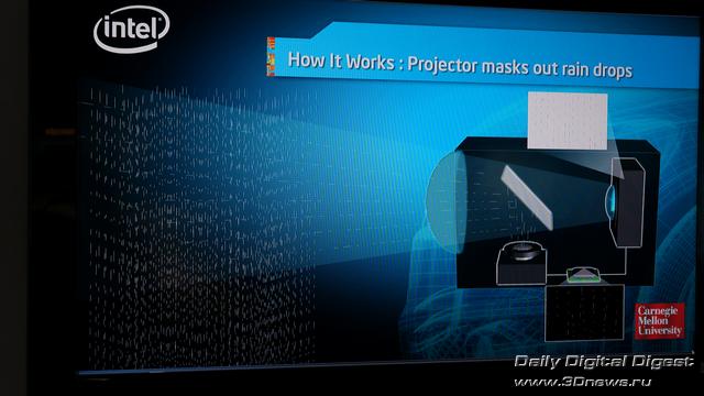Seeing Through Rain – разработчики из Intel Labs совместно с коллегами из университета Карнеги — Меллона и технологического центра встраиваемых систем Intel показали интереснейший концепт интерактивного лобового стекла для автомобиля, позволяющего в буквальном смысле "видеть сквозь дождь".