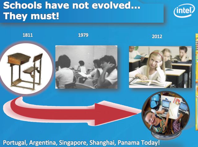 Одна из лекций, представленных нам в рамках Research@Intel 2012, была полностью посвящена задачам, стоящим перед современным образованием, и методам их решения. В ходе лекции было приведено и немало положительных примеров. В своём выступлении с говорящим названием The Learning Economy Брайан Гонзалес (Brian G. Gonzalez), глава Глобального центра образования (Global Education Sector) компании Intel, в качестве основных стимулов скорейшего перевода образования на современный лад подчеркнул самые важные: рост конкурентоспособности страны, рост благосостояния за счёт возможностей быстрого обучения и переучивания, выравнивание доходов и общего образовательного уровня вне зависимости от городского или сельского проживания и так далее.