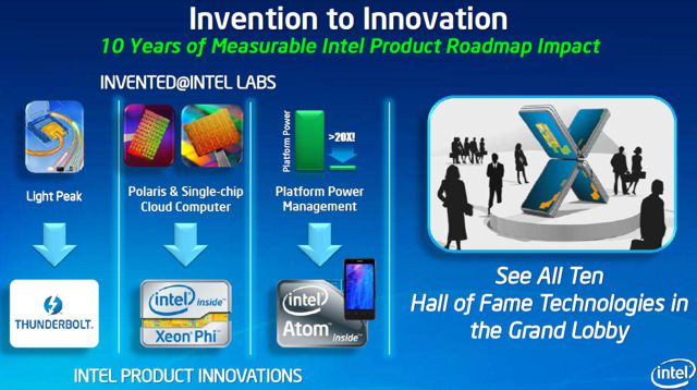 Исследовательское подразделение, известное ныне как Intel Labs, было учреждено ещё в 2001 году, а первое мероприятие Research@Intel для журналистов состоялось в 2003 году. За эти годы из стен лабораторий вышло множество уникальных разработок, включая такие, как, например, процессоры Intel Atom, беспроводная технология Intel Wireless Display (WiDi), технология Vanderpool в составе Intel Virtualization Technology или технология Patmos, интегрированная ныне в серверную защиту McAfee DeepSAFE. Именно там была разработана технология с рабочим названием Light Peak, которая впоследствии вылилась в реализацию нового скоростного интерфейса Thunderbolt.