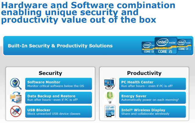 Ещё один доклад от подразделения клиентских бизнес-платформ Intel под названием Introducing Intel Small Business Advantage, представленный Тери МакФол (Teri McFaul), был посвящён вопросам развития компьютерных систем для современного малого бизнеса. Здесь присутствует своя специфика, однако такие задачи, как защита и сохранность данных, энергосбережение, производительность и гибкость настройки, не менее важны.