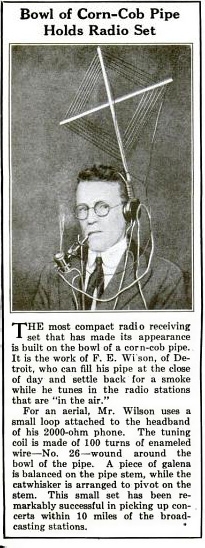 Конечно, в пятидесятых такое радио уже трудно было воспринимать всерьез, но в двадцатых годах такой «гаджет» вызвал бы изумление. Изобретатели уже тогда задумывались, как бы им сделать детекторный приемник более портативным. Порой стремление создать сверхудобное и суперкомпактное радио доходило до абсурда. Например, в 1922 году в сентябрьском выпуске журнала Popular Science на полном серьезе демонстрировалась модель детекторного приемника с антенной, которая позволяла курить трубку и слушать радио одновременно.