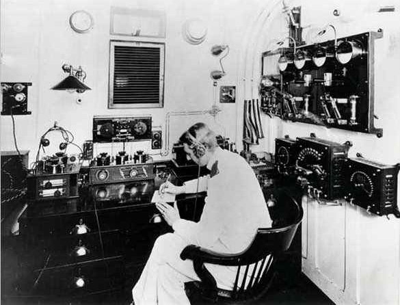 Отсюда 15 апреля 1912 года были посланы сигналы бедствия. Качество снимка не очень хорошее, однако, если присмотреться, можно увидеть дугу наушников на голове человека. Двоящееся изображение — это, очевидно, отражение стекла, через которое сделан снимок.