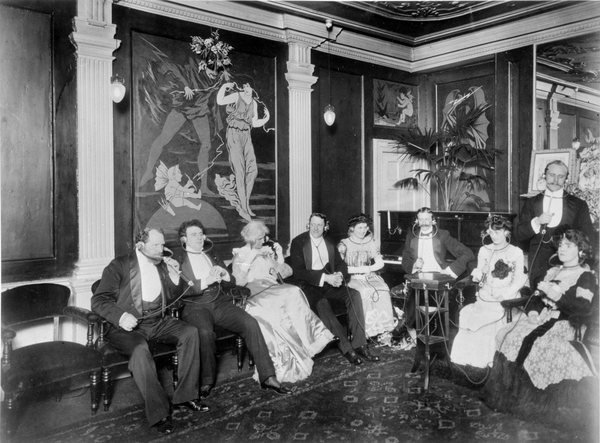 Для прослушивания всех этих трансляций клиентам выдавались специальные наушники, которые, по правде говоря, больше походили на швабру. По сравнению с классическими головными телефонами, которые мы привыкли видеть на головах меломанов, их предшественники были «перевернутыми» и надевались так, что дуга оставалась со стороны подбородка. Их можно было поддерживать специальной тростью. Зато (вот это сюрприз!) на каждое ухо транслировался звук с отдельного микрофона. Это была одна из первых попыток создать стереозвук.