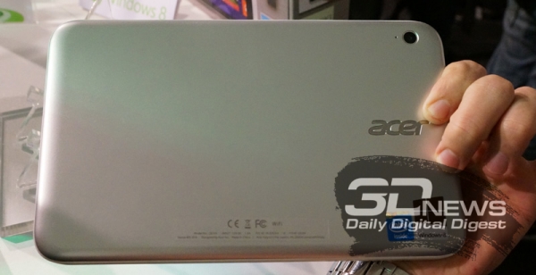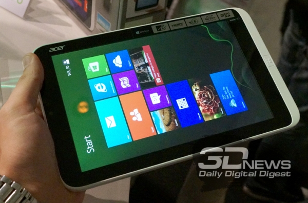 Главной новинкой стал первый в мире 8-дюймовый планшет на базе операционной системы Windows 8. Модель Acer Iconia W3 имеет 8-дюймовый экран с разрешением 1280х800 точек, процессор Intel Atom Z2760, 32 или 64 Гбайт флеш-памяти, оснащена 2-Мп основной камерой, есть и фронтальная. Нельзя не упомянуть разъемы micro-USB, micro-HDMI, microSD.