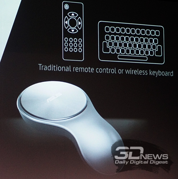 Для управления данным HTPC ASUS предлагает отказаться от привычных клавиатуры и мышки, а воспользоваться еще одной новинкой — VivoMouse. Производитель ее называет первым в мире гибридным манипулятором, вобравшим в себя функции как мыши, так и тачпада. Тут можно вспомнить Apple MagicMouse, хотя устройство ASUS выглядит куда футуристичнее. Тачпад новинки поддерживает жесты операционной системы Windows 8, что должно облегчить процесс управления компьютером сидя на диване.