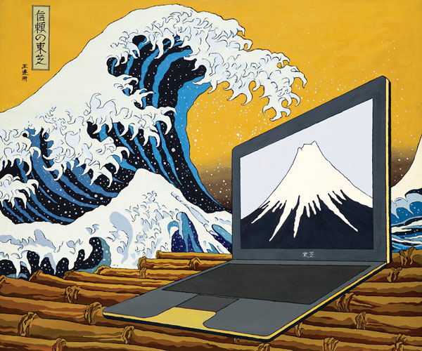 Еще одно произведение, изображающее ту же модель Toshiba. Правда, тут художник уж очень сильно польстил Satellite U500 – в реальности ноутбук далеко не такой тонкий, каким выглядит на картине. В отличие от предыдущего полотна, здесь логотип все-таки имеется – два иероглифа под дисплеем являются настоящим, японским написанием Toshiba.