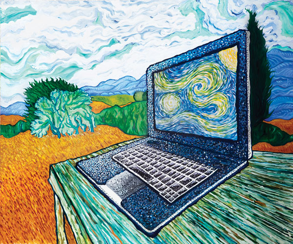Начнем с творчества одного из известнейших художников-постимпрессионистов – Винсента Ван Гога – вернее, с переосмысления этого творчества художником Toshiba. Это один из нескольких случаев в данной экспозиции, когда создателю полотна далось добиться хорошей узнаваемости ноутбука без размещения на нем логотипа. Характерная форма сенсорной панели и линии корпуса мгновенно выдают в изображенном портативном компьютере Toshiba Satellite U500.