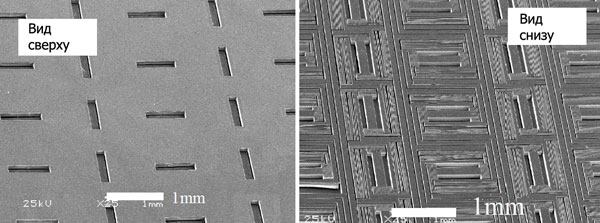 Фото одной дюзы MEMS-транспортера крупным планом. Слева изображена рабочая поверхность транспортера, справа – механизм, спрятанный под нею