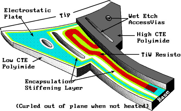 Начнем с одного из наиболее впечатляющих устройств. Это MEMS-транспортер, состоящий из массива микроскопических ресничек. Реснички упругие и в «выключенном» состоянии они отогнуты от основания. Чтобы притянуть их к подложке, используется уже знакомый нам по DMD-чипам метод – электростатическое притяжение. Кроме того, в реснички встроен терморезистор, за счет нагрева изменяющий упругость реснички.