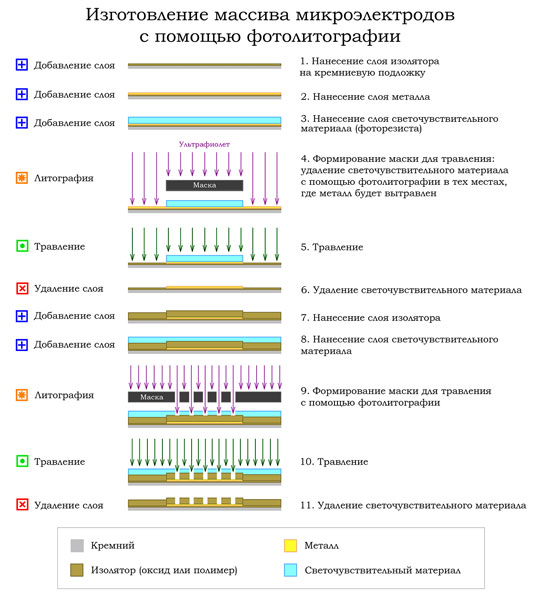 Теперь немного о том, как вся эта красота появляется на свет. Если в двух словах: при производстве MEMS-устройств используются примерно те же процессы и материалы, что и при производстве микроэлектроники. В качестве примера рассмотрим одну небольшую и относительно несложную задачу: производство массива микроэлектродов.