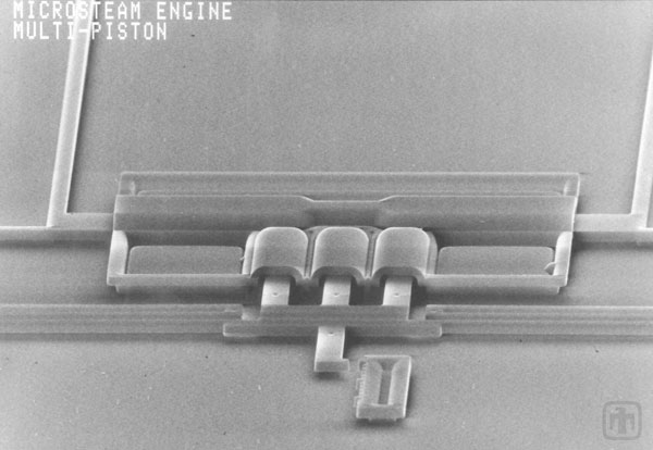 Сотрудники Sandia создали микроскопический паровой двигатель. А вернее, даже целых два: одноцилиндровый и трехцилиндровый. Сложно сказать, какие цели они преследовали на самом деле – не исключено, что ученые и сами до конца это знали. Однако получилось весьма экстравагантно. Ну и потом – как ни крути, это самый миниатюрный паровой двигатель в мире!