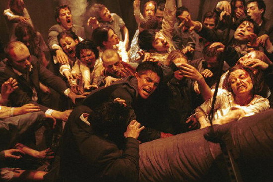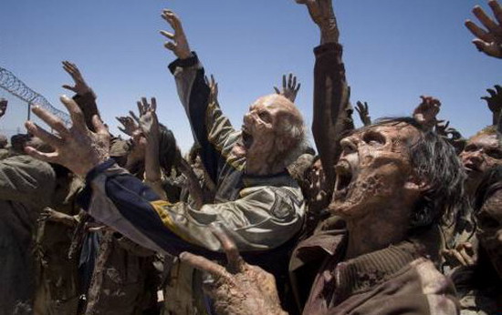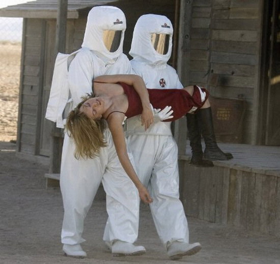 Действие в Resident Evil: Extinction разворачивается спустя несколько лет после событий второй части. Ракун-Сити, уничтоженный ядерной боеголовкой в конце Resident Evil: Extinction, не смог похоронить под своими обломками Т-вирус, и тот распространился не только по США, но и по всему свету. Мир превратился в безжизненную пустошь, по которой разгуливают зараженные люди и животные. Здоровых сохранилось немного. Зловещая корпорация Umbrella по-прежнему колдует над вирусами, а также разрабатывает проект "Элис", в рамках которого создает клонов Элис. Последние, правда, получаются с изъяном, и их бесцеремонно выбрасывают. В третьей части встречаются элементы из первого фильма. Так, зрители вновь увидят жуткий коридор с лазерами, а место "Красной королевы" заняла "Белая королева". Именно она рассказывает Элис о том, что ее кровь является средством исцеления от Т-вируса. Собрав своих клонов в боеспособный отряд, Элис решается пойти в атаку на правительственную штаб-квартиру. Resident Evil: Extinction получился не таким прямолинейным экшеном, как вторая часть, но также не дотянул до первой по качеству интриги и саспенса. Есть в фильме впечатляющие сцены (например, нападение зараженных птиц), но хватает и странностей. Так, зомби передвигаются очень быстро, а не "классически" медленно и жутко. Видимо, сценарист здесь отдал дань моде на "бегающих" зомби. В случае с траншеей, наполненной выброшенными клонами Элис, непонятно, почему тела не начали разлагаться, а выглядят так, словно погибли позавчера. ![]() Эти зомби активнее прежних (Resident Evil: Extinction).