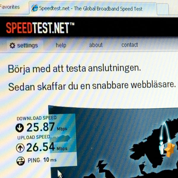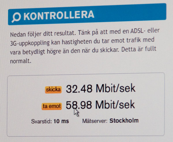 Шведский аналог Speedtest выдал более впечатляющие цифры — почти 60 Мбит/с! Скорость загрузки была поменьше — "всего" 32 Мбит/с.