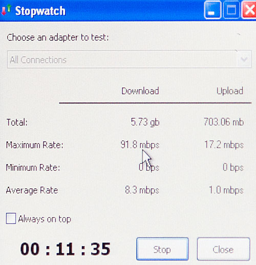 Программа StopWatch, установленная на ноутбуке, сообщила, что максимальная скорость загрузки данных во время поездки составила почти 92 Мбит/с! По заявлениям представителей TELE2, во время лабораторных испытаний им удалось и вовсе зафиксировать скорость около 165 Мбит/с. Понятно, что обычные абоненты такие цифры вряд ли увидят, но даже если оператору удастся обеспечить стабильную работу на скоростях 25-30 Мбит/с, этого для 99% пользователей будет вполне достаточно.