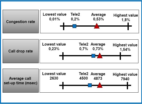 Как видно, уровень перегруженности каналов, обрывов звонков и среднее время установления соединения лучше средних показателей в индустрии. Что касается развития 4G-сетей, то планы TELE2 в Швеции выглядят так: