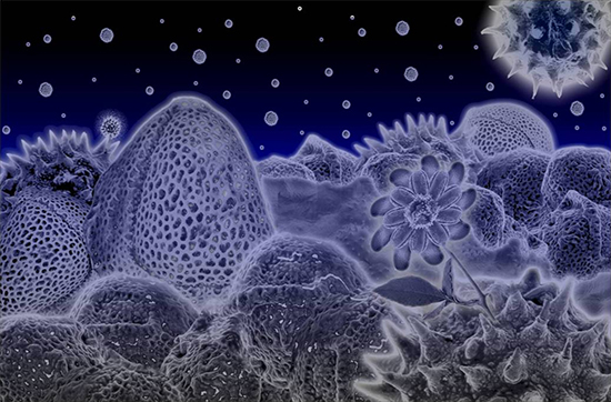 А этот ночной пейзаж составлен из РЭМ-фотографий частиц пыльцы, покрытых оксидом алюминия.