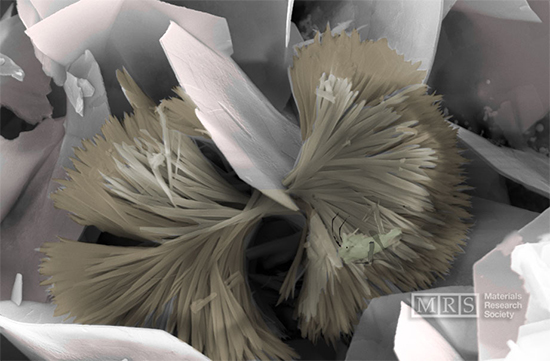 А вот и родные подсолнухи! Правда, родом они не с Украины и не с российского юга, а вовсе даже из Китая. И выросли они не сами, а были синтезированы в ходе реакции кремния с кислородом, где в качестве катализаторов выступали расплавленные галлий и золото. В середине «цветка» нановолокна оксида кремния (толщиной порядка 10 нм, между прочим) упакованы плотно, а по краям – гораздо более рыхло, за счет чего и образуются «лепестки».