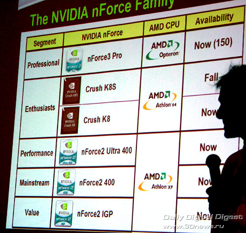 С одной стороны у нее есть совершенно коронный номер в лице nForce II 400 Ultra - НО ДЛЯ УМИРАЮЩЕЙ АРХИТЕКТУРЫ AMD ATHLON XP, из которой уже выжаты все последние соки и частоты, а в графическом плане ее стремительно подпирает ATI со своей линейкой Radeon.
