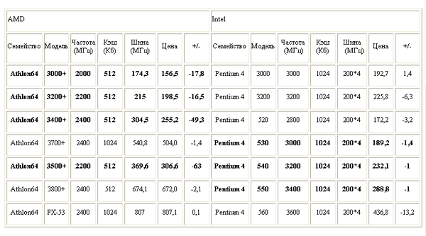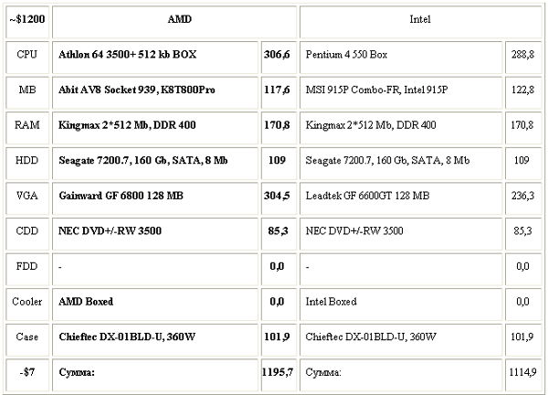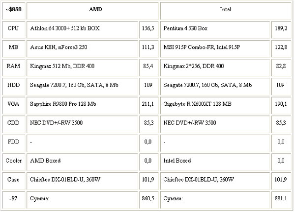 Компьютеры высшего ценового диапазона по большому счету кардинально ничем не отличаются от своих более дешевых собратьев: одна компонента побыстрее, другая помощнее, третья с лучшим дизайном. В результате покупатель получает оптимальный максимум производительности на сегодняшний день. Если этот термин не ясен, то поясню - оптимальный максимум достигается тогда, когда идти дальше непропорционально дорого. Иными словами за пять процентов дополнительной производительности придется переплатить 25-50% и более. И, разумеется, моей задачей будет указать эту оптимальную границу. Иначе бы этот выпуск не имел бы никакого смысла. Можно было бы просто отписаться, просто посоветовав приобретать самые дорогие комплектующие. Подводя небольшой итог, замечу, что стоимость подобных систем начинается с ~$800. Верхнюю границу каждый определяет для себя сам". Расставив все точки над "I", перехожу к выбору комплектующих для нашей "оптимальной системы". Существуют два подхода к подбору такой конфигурации. Первый - "Купил и забыл". Доход людей, делающих так несомненно велик. Впоследствии состоятельному человеку будет проще по прошествии двух-трех лет продать/отдать/оставить старый и купить новый компьютер, а не возиться с заменой отдельных частей. Второй подход "Расчет с прицелом на будущее". Купить компьютер с самыми значительными возможностями для расширения. На сегодняшний день, это прежде всего шина PCI-Express, Socket 939 или Socket 775. Дабы не быть голословным, приведу такой пример. Очень дорогой компьютер трехлетней давности: Pentium4 2.0/AthlonXP 1900+, Socket 478/462, i850/KT266a, RIMM/DDR, 64 MB GeForce3. Сегодня можно было бы заменить в нем и процессор уровня 3000-3200, если материнская плата поддерживала бы новую процессорную шину (возможно при разгоне), и установить мощную видеокарту так как AGP 8x обратно совместима с AGP 4x (напряжение 1,5 v). Но ведь вы могли и просчитаться, купив систему на полгода раньше, когда еще не было AthlonXP и Socket 478. Так что такой подход более рискован. Хоть и сулит меньшие затраты. Платформа и процессор![]() Жирным в табличке я выделил модели процессоров, рекомендуемые к покупке. Они наиболее подходят по соотношению цена/производительность. Выше - слишком дорого, а ниже - производительности маловато. Стоит отметить резкое снижение московских цен на процессоры Athlon64 рейтингов 3500+ и ниже. Связано оно с выходом на рынок, пока не наш , топовых процессоров Athlon64 4000+. Представляющего собой точную копию процессора Athlon FX-53 (2400 МГ/1024Кб) и Athlon FX-55 - первый процессор AMD с частотой 2,6 гигагерц. По предварительным тестам - это новый лидер по производительности. В стане Интел все спокойно, цены немного снизились, но в целом остались на тех же отметках. Наиболее перспективной с точки зрения дальнейшего апгрейда, на данный момент является платформа Intel Socket 775. Здесь и новый процессорный разъем, и PCI-Express. И неофициальная поддержка некоторыми производителями будущей 1066-процессорной шины (Abit, Asus и другие). Платформа AMD Socket 754 и Socket 939 уступает, так как платы на последнем чипсете nVidia nForce4 еще до нас не доехали и PCI-Express вместе с ними. Однако не стоит расстраиваться и думать, что она не на что не годится и ее не стоит покупать. Напротив, очень даже стоит тем, кто хочет "купить и забыть". Так как мощных видеокарт для платформы PCI-Express с приемлемой стоимостью пока нет. Об этом подробней в следующем разделе. Так что, если вы с