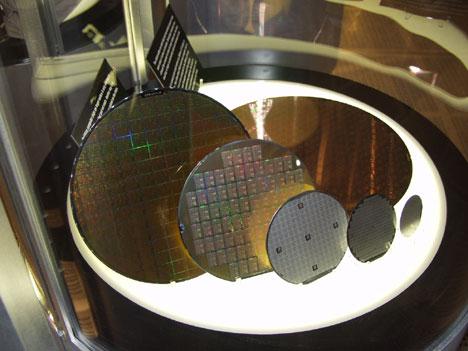 Вся коллекция типоразмеров силиконовых пластин Intel. Самая миниатюрная - это двухдюймовочка, далее по нарастающей – 3, 4, 6, 8 и лежит 12-ти дюймовая пластина (300 мм, как виниловый LP диск).