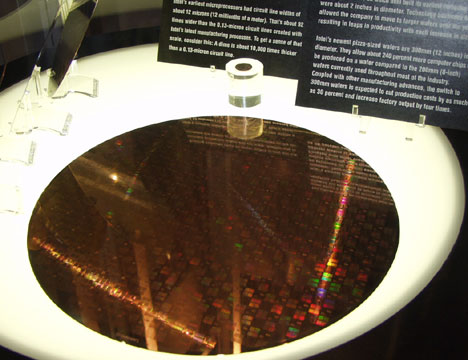 Последнее достижение Intel - 300 мм пластина с технологией изготовления процессоров нанесения 0.13 мкм - Pentium 4 "Northwood". Фото сделано нами в штаб-квартире Intel (Сан Озе)