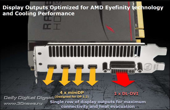 Для отвода такого количества тепла необходима мощная система охлаждения. В случае Radeon HD 6990 — это двухслотовый кулер с двумя испарительными камерами. На заднюю панель выведено пять портов: один DL-DVI и четыре Mini DisplayPort 1.2. Кроме того, в комплект поставки новинки включены три переходника: Mini DisplayPort -> SL-DVI Passive, Mini DisplayPort -> SL-DVI Active и Mini DisplayPort -> HDMI Passive.