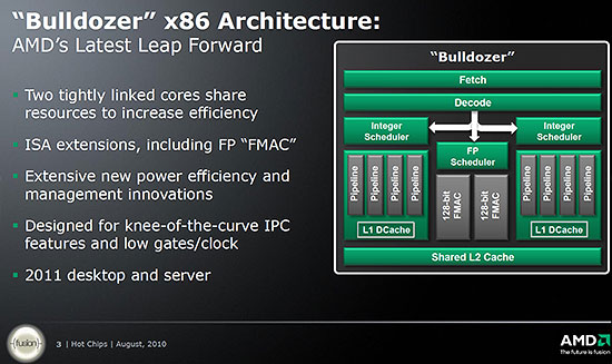 Одновременно с анонсом Bobcat компания AMD раскрыла подробности архитектуры Bulldozer — процессоры на ее основе нацелены на самый широкий сегмент рынка, в том числе и на серверный. Что же AMD собирается противопоставить Intel, которая уже совсем скоро выпустит на рынок кристаллы Sandy Bridge? Итак, ядро Bulldozer имеет 8 целочисленных конвейеров, для сравнения, у решений на базе К10 их было только 3. Два целочисленных блока, каждый из которых имеет собственную кеш-память первого уровня, работают практически независимо и используют общий блок вычислений с плавающей запятой. AMD предпочла встроить параллельную многопоточную обработку в процессор, что позволит каждому блоку работать с собственным потоком. По мнению компании, такой подход более эффективен, чем технология Hyper Threading, которую использует Intel.