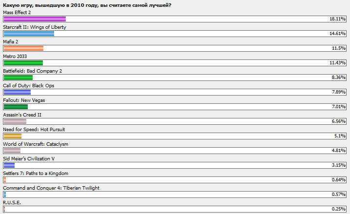 Наибольший интерес читателей 3DNews вызвало голосование по выбору лучшей игры 2010 года – в опросе приняло участие более 10 тысяч человек. Итак, лучшим игровым проектом ушедшего года стала RPG Mass Effect 2 – 18% голосов. Чуть меньше набрала стратегия Starcraft II: Wings of Liberty. На третьем месте продолжение гангстерской серии Mafia 2. Лишь семь сотых процента не хватило шутеру Metro 2033, чтобы попасть в призовую тройку.