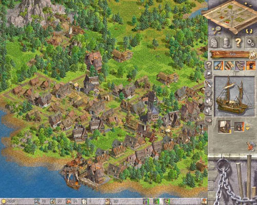 Основа игры совершенно классическая, да возрадуются поклонники Knights and Merchants,. выходивших под маркой 1C как "Вторая Корона" - вам надо выстроить экономически эффективный город. Эдакий вот у вас средневековый Simcity. Внимание - ищем десять отличий. Во-первых, все миссии всегда проходят на островном архипелаге. На каких-то островах будет ваш город, какие-то надо исследовать, какие-то заселить, на каких-то уже есть жители и с ними надо вступать в простейшие дипломатические отношения и торговать. Торговля - это как раз и есть во-вторых: подобно поклонникам Индустриальных Гигантов и моделирования железных дорог - вы указываете своим кораблям сложные путевые маршруты, с указанием, где что продавать и где что покупать - ведь некоторые острова могут вырабатывать одни ресурсы, а некоторые другие, а разве будут ваши граждане счастливы, если у них, к примеру, негде взять специй или табака? Третий элемент - это война. Война в немецких стратегиях была и раньше, но тут она "цивилизовалась", так сказать, примерив на себя все традиционные компоненты варкрафто-дюновских стандартов. А может, стандарты уже Казачьи - учитывая важность постройки стен и башен? К счастью, война не стала основной идеей игры. Основной идеей по-прежнему остается "мега-тамагочи". В четвертых - это ничего не меняет по большому, но штрих интересный - имеется элемент исследовательской такой романтики - когда надо подплыть На Своем Парусном Корабле к неизведанному острову (только тогда можно увидеть, что на нем), затем высадить туда для исследований разведчика - мужчину с осликом, суммарной грузоподьемности в десятки тонн. Прямо Star Control какой-то :) В общем, повспоминали все игровые жанры, какие были, и все что могли, упаковали в одну игру.