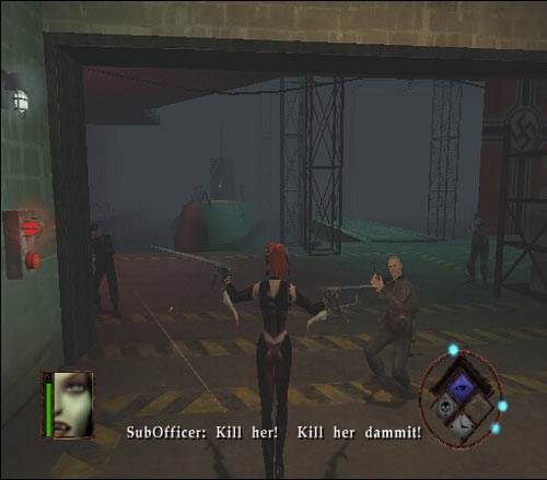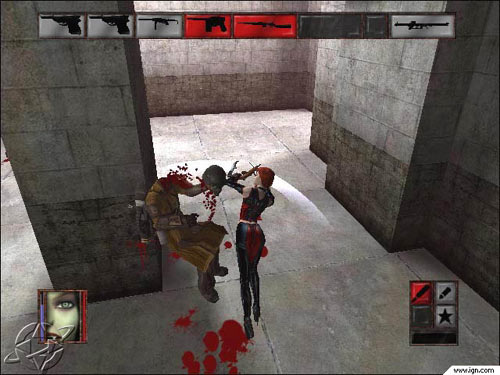 Впрочем, и с мелкими противниками хлопот будет достаточно - так, это единственная на нашей памяти игра, где зомби, к примеру, пользуются огнестрельным оружием и даже кидают гранаты. Достаточно неприятный факт, когда играешь в 3d-action, а не fps - входящий огонь неизвестно откуда может потрепать вам немало нервов. Потом, кстати, зомби сменятся нацистскими солдатами - потому что генеральная идея сюжета (не слишком существенного), это "вампиры против фашистов". Любителей "чистого мяса" может покоробить необходимость время от времени попрыгать "с кочки на кочку" с возможностью свалиться в агрессивную для вампиров воду, или побегать по электрическим проводам - зато они будут вознаграждены … тем самым "мясом", потому что отрываний голов, разрывания на куски, кровищи и тому подобное в Bloodrayne более чем достаточно. Хотя эта как раз игра не сделана так, что доставляет удовольствие сам процесс убийства - не хватает артистизма в анимации что ли. Скорее радует общий набор возможностей, могущество и эффективность героя, общая атмосфера происходящего.
