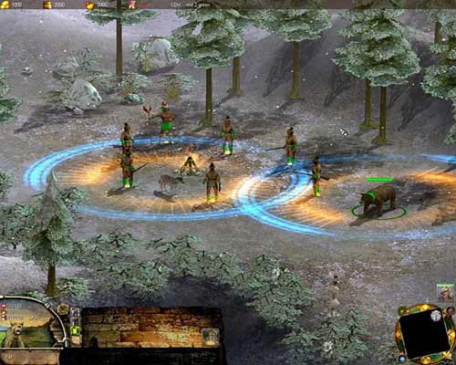 И как раз в игровой механике, предназначенной к многопользовательской цели - параллели с Warcraft III особенно бросаются в глаза (с некоторой поправкой, правда, на AgeOfEmpire-схему). Все ориентировано на скорость, на понятность, на очевидность. На то, чтобы действовать автоматически, держа в голове предразработанные цепочки стратегий - чтобы резво шевелить мышкой, оперативно оценивая складывающуюся обстановку. Достаточно сжатый ассортимент прекрасно распознаваемых зданий - управляющие панели которых оснащены очень качественными и понятными 2d-пиктограммами. Три ресурса: золото, что берется из шахт и его нужно носить на базу или в склад; пища, добываемая построением на "плодородной земле" фермы с ограниченным количеством работников (и "участок плодородной земли" - такая же редкость, как и "выход золота на поверхность", позволяющий строить шахту); дерево - что берется в изводимых постепенно под корень лесах. Каждый производственный процесс имеет один-два апгрейда. Крестьяне, кстати делятся на мужчин и женщин - последние стоят меньше, зато не могут сражаться в случае необходимости.