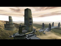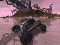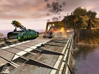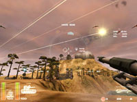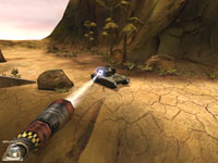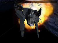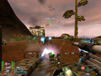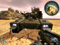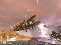 А вот машины, надо сказать, порадовали. За исключением, правда, стационарных орудий и монтированных на джипе (компьютерный водитель вез с томительной скоростью в час по чайной ложке, предоставляя возможность стрелять) - при всей их внешней красоте огонь неприятный и более того - неэффективный. Пулемет все же должен сметать живую силу на своем пути, а не слепо шарить меж силуэтами нападающих, иногда выискивая цель. Игровой пулемет, по крайней мере. А вот танк - совсем иное дело: шасси управляется кнопками перемещения, а башня - мышкой. И вооружение у него, надо сказать, преприятнейшее - мощная плазменная пушка, мощный пулемет, неуправляемые ракеты и управляемые ракеты (способные снимать цели высоко в воздухе). Плюс к тому дополнительный стрелок на выделенном пулемете, вполне способный отбиваться от второстепенных целей, пока вы занимаетесь основными. Танки, кстати, в этой игре - с тормозами-якорями, способными остановить махину почти мгновенно и предотвратить скатывание под уклон (хотя отдачи от выстрелов все равно никакой). Еще приятнее в применении - истребитель, представляющий в данном далеком будущем эдакий гибрид самолета и псевдовертолета с реактивной тягой. В первом режиме он летает буквально как самолет, где стрелки вперед-назад очень удобно регулируют тягу, мышка рулит штурвалом, а влево-вправо позволяют эффективно подруливать. Второй режим позволяет переключать вертикальную тягу между подьем-спуск-автостабилизация а горизонтальная задается кнопками. Чуть разобравшись - получаешь серьезное удовольствие от полета (именно аркадное, конечно, а не авиасимное - но есть возможность и к совершенстованию, и к хитрым кульбитам, и кстати к крушениям о землю и постройки, потому что есть и штопор, и заваливание на крыло итд) и стрельбы: вооружен данный аппарат пушкой, управляемыми и нет ракетами (с выбором целеотслеживания воздух-воздух и воздух-земля), а также бомбами. Именно с высоты, понимаешь, почему миры Breed так скуповаты на растительность и не богаты сооружениями - разработчики хотели создать по-настоящему крупные ландшафты, с обработкой серьезных высот и широкими просторами. Реально тут есть и горы, и высотки, и утесы с обрывами, и окольцовывающие холмы пути, и массивные сооружения, и титанические машины конечно :)