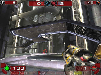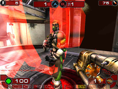Пару слов о AI противника. Чтобы проверить - насколько силен мой оппонент, мы поставили самый мощный (в игре он значится как "крутой") уровень ботов. В ходе поединка вспомнился режим Quake III: Arena" - Nightmare. Победить компьютерного визави практически невозможно. Он не просто очень хорошо двигается и метко стреляет. Бот научился защищаться! Практически всегда неприятель занимает лучшую (скажем, на вершине карты) позицию или стреляет, находясь рядом с углом, чтобы мгновенно спрятаться. Лишь иногда сталкиваешься с ним лоб в лоб. У меня был случай, когда я, накопив три заряда ракетницы, вылетел прямо на врага. За доли секунды я успел порадоваться "вот тебе и крышка!" и разрядить пушку. Но не тут то было! Бот присел, пропустив адский удар над головой. На той же секунде я был яростно атакован.