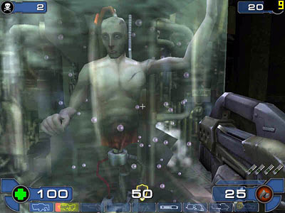 На уровне "Инсидиос" мы заметили проспиртованное существо, томящееся в большой закрытой ампуле. Подошли поближе. Боже мой – это же человек! Правда, нижняя часть его металлическая. Продукт опытов шевелил глазами, таращился и пытался выбраться из замкнутого пространства, отчаянно дергая руками. Мы любовались на это зрелище, пока не получили ракетой в спину (шла ожесточенная дуэль).